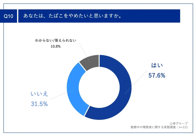 心幸グループが発表した、勤務中の喫煙に関する実態調査では、「あなたは、たばこをやめたいと思いますか。」という質問(n=111)に対し、「はい」が57.6%、「いいえ」が31.5%という結果となりました。この結果から、過半数の喫煙者が禁煙への意向を持っていることが明らかになっています。