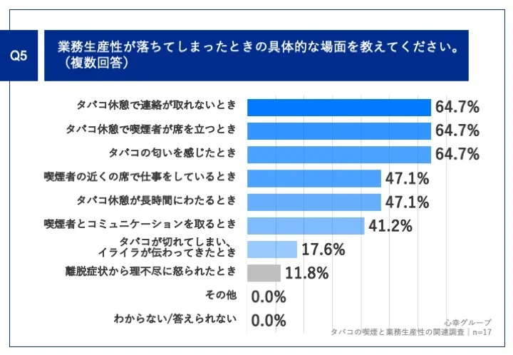 実際に、心幸フループが発表した、喫煙が職場環境に与える影響についての調査では、「Q4.同じ部署に喫煙者がいることで起こる職場への影響を教えてください。」という質問で「周りの人の集中力が切れ、業務生産性が落ちること」と回答した方に対し、「業務生産性が落ちてしまった具体的な場面」を尋ねたところ(n=17)、「タバコ休憩で連絡が取れないとき」「タバコ休憩で喫煙者が席を立つとき」「タバコの匂いを感じたとき」がいずれも64.7%と高い割合を占めました。こうした結果からも、喫煙が周囲の業務効率や職場環境に影響を与えていることがうかがえます。