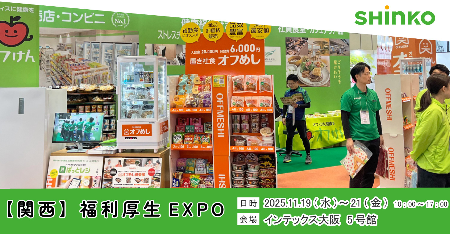 従業員エンゲージメントを高める福利厚生サービスが集結する展示会「関西 福利厚生EXPO」に心幸グループが出展します。心幸グループが取り扱う、置き社食・ミニコンビニ「オフめし」や、健康経営サポート「オフけん」、企業内の24時間無人売店「心幸ストア」等のサービスをご覧いただきながら、スタッフがご案内します。