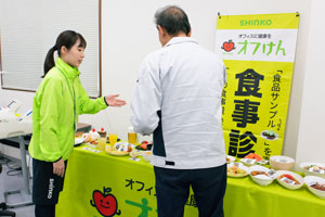 5人ずつのグループで参加しました。「栄養摂取量が足りていないね」「ビール飲みすぎでしょ」などの会話が生まれました。普段関わることの少ない部署の方と結果について盛り上がり、交流のきっかけになりました。